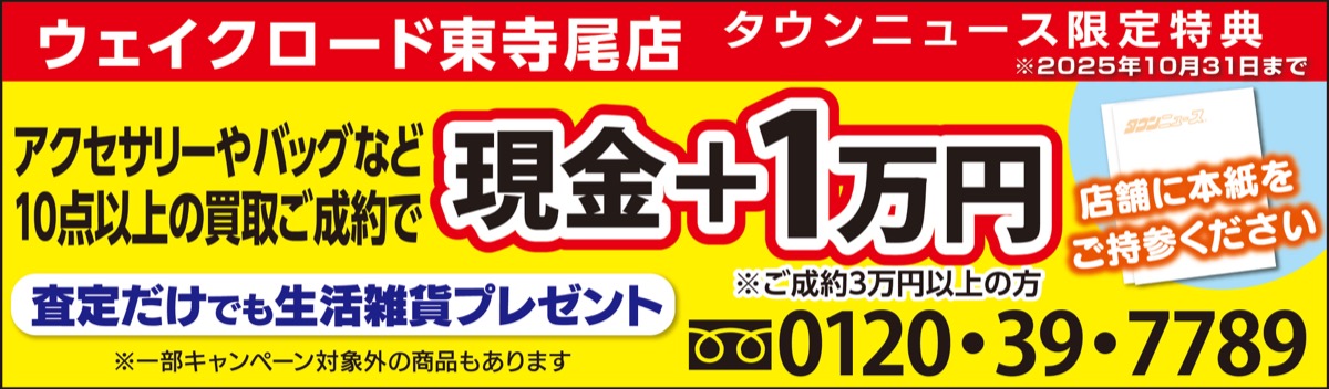 買取専門店「おたからやウェイクロード東寺尾店」では、10月末までアクセサリーやブランドバッグなどの買取を強化中。10点以上の買取成約で、買取金額に1万円を上乗せするキャンペーンを実施している。スタッフは「まとめてのご相談がお得です。今は使わなくなった指輪やネックレス、ブランドバッグや時計など、ぜひ査定してみませんか」と話す。