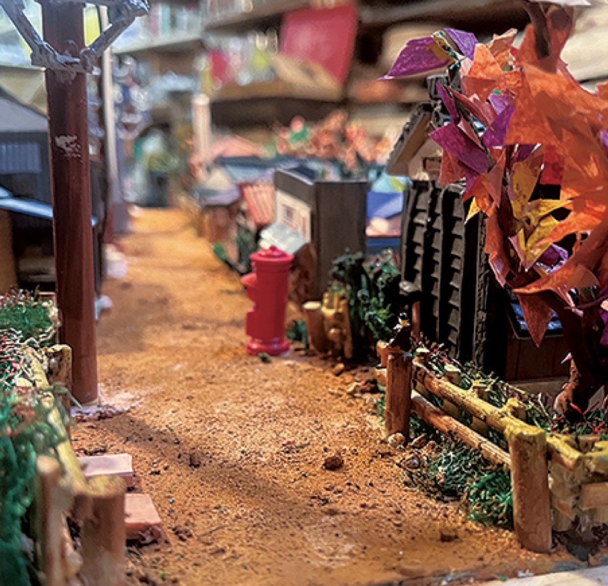 そして、制作では米谷さんが主導。家屋などの材質は発泡プラスチックや粘土などを使い、一軒一軒の屋根や電柱も手作り。3Dプリンターも駆使して、細部まで再現した。まちの色合いも当時の記憶を基に鮮やかに表現。「実際は灰色の屋根が多かったと言われていますが、カラフルな方が見て楽しめるかなと。実際に見た方から『この家はこんな色じゃなかった』などの声をもらえれば、もっと精巧に作り込んでいけると思うので、ぜひお声をいただけたら」と米谷さん。