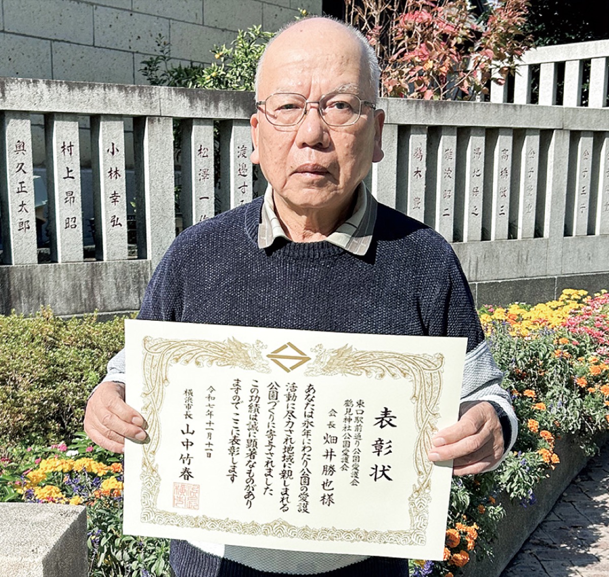公園管理に貢献し、10年以上にわたり愛護会の会長を継続して務めた人を表彰する個人表彰の部では、須藤孝さん(尻手二丁目公園愛護会)、本田信夫さん(生麦公園愛護会)、畑井勝也さん(東口駅前通り公園愛護会・鶴見神社公園愛護会)の3人が受賞。畑井さんは「あっという間の10年。会員の皆さんのおかけで楽しく務められました」と喜びを語った。