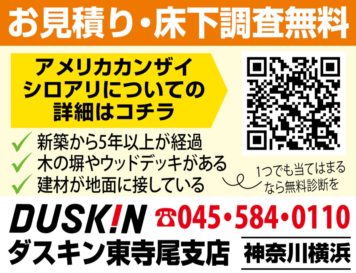 シロアリ駆除のプロ、ダスキン東寺尾支店のスタッフによると数年前から鶴見区内でも多数の被害が出ているという。「小さな穴から茶色い粉のようなフンが落ちている、家の近くで羽アリを見かけたら要注意です」と呼び掛ける。