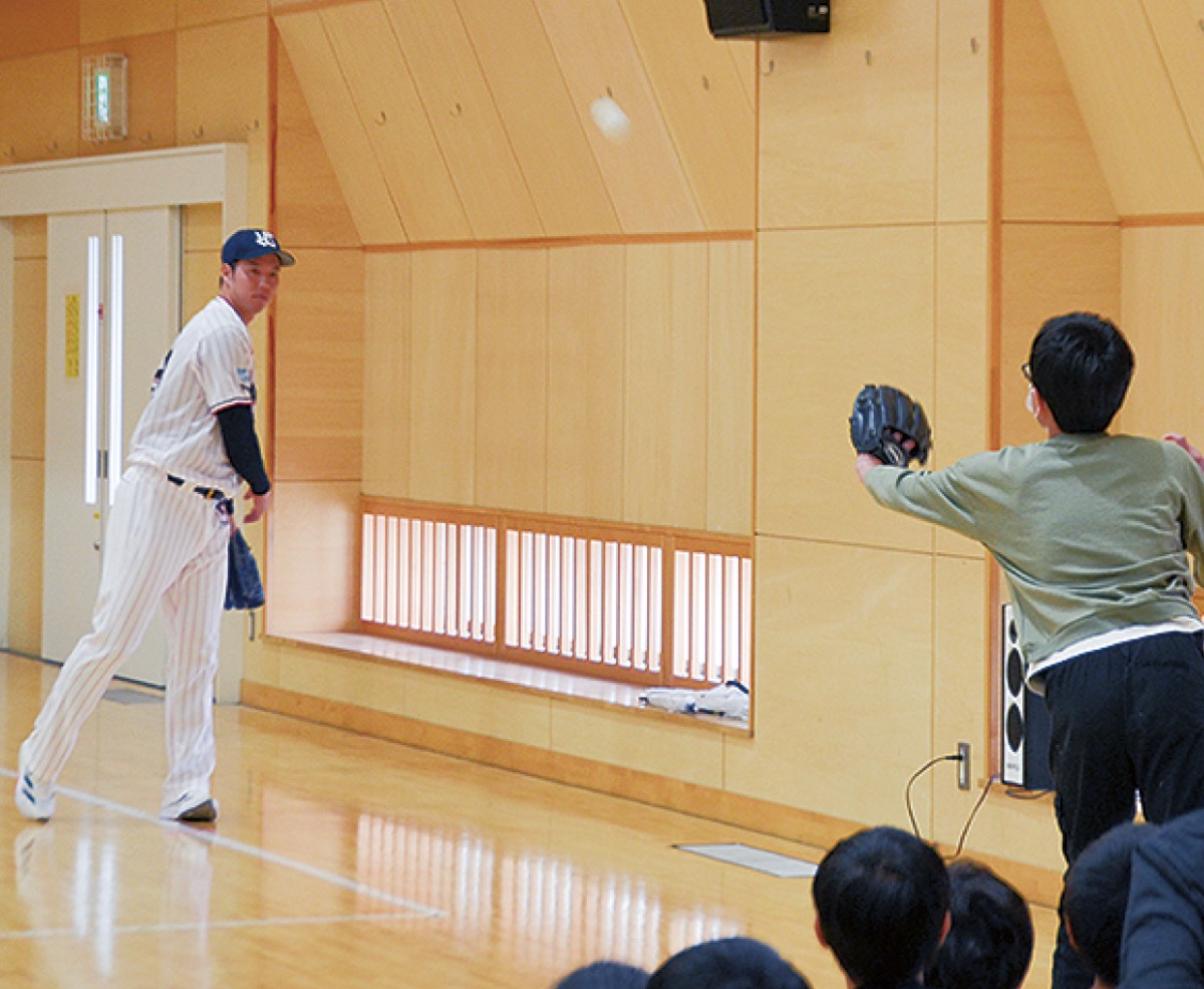 最後には児童代表らとキャッチボールを楽しんだ青柳選手。「僕も毎年子どもたちから元気をもらっている。彼らの記憶に少しでも残るような活躍を見せたい。この活動が練習のモチベーションにもつながっています」と笑顔で語った。