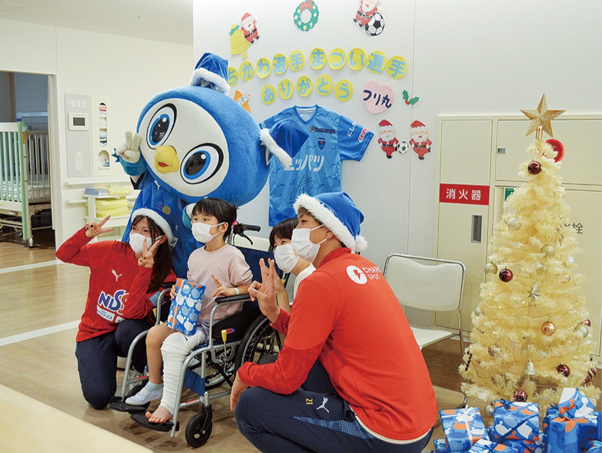 ニッパツ三ツ沢球技場をホームスタジアムとするプロサッカーチームの横浜FCは12月10日、横浜市立市民病院を訪問し、小児病棟に入院する子どもたちにプレゼントを渡した。当日は同チームの片原大示郎代表や市川暉記選手、ニッパツ横浜FCシーガルズの松井里央選手、オフィシャルマスコットの「フリ丸」が来院。同院の職員と懇談した後、小児病棟を訪れ、子どもたちに同チームのグッズなどをプレゼントした。