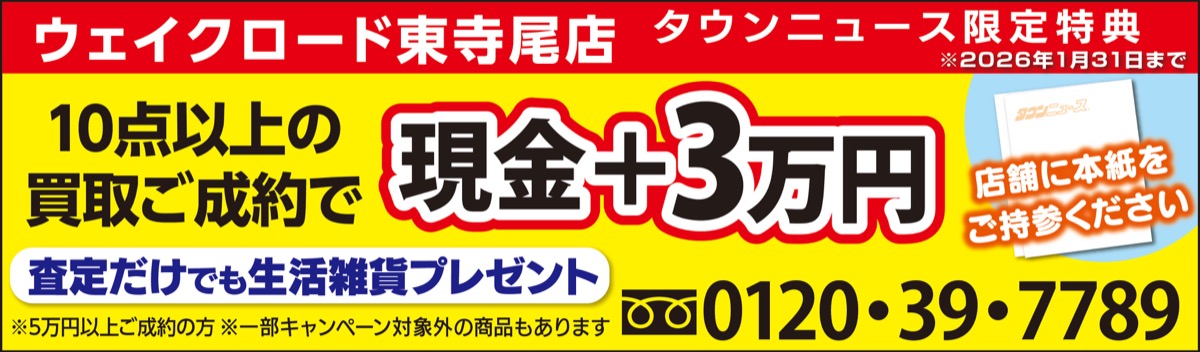 東寺尾の商業施設「ウェイクロード横浜鶴見」2階の買取専門店「おたからやウェイクロード東寺尾店」は、新年を記念して10点以上の買取成約をした人を対象に、買取金額に現金3万円を上乗せするキャンペーンを行っている。スタッフは「金の高値が続いていますので、お得な機会に査定だけでもしてみませんか。貴金属製品やブランドバッグなど、ぜひまとめてご相談ください」と話す。