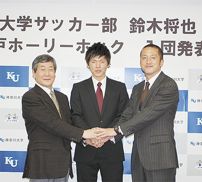 神奈川大学サッカー部のMF鈴木将也さん(人間科学部4年)が1月13日(木)、プロサッカー・J2リーグの水戸ホーリーホック入りすることを決め、神大横浜キャンパスで入団発表を行った。