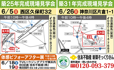今回、その見事な再生実例宅を5日(日)と26日(日)に、それぞれ下記の会場で見学できる。同社の耐震補強技術や施工品質・最新の住宅設備機器などを実際に見て、触れて、確かめてみては。本紙持参の来場者には粗品をプレゼント。
