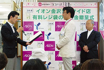 また2007年6月以降レジ袋無料配布を中止しているイオン金沢シーサイド店は同日、有料レジ袋の収益金27万5112円(2011年度)を横浜市環境保全基金へ贈呈。贈呈式では市・環境創造局の小林正幸部長から南関東カンパニーの神戸一明事業部長に感謝状が贈られた。神戸事業部長は「環境保全に関しては寄付金が0になることが望ましい」とし、今後の活動に意欲的な姿勢を示した。
