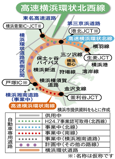 現在、市は北西線と北線のほか、「高速横浜環状南線」「横浜湘南道路」も事業中となっている。市内に「横浜環状道路」を造るため、北線と南線、計画中の「横浜環状道路西側区間」を高速道路で結ぶ事業を計画している。市道路局事業調整課担当者は「(横浜環状道路が完成すれば)市内一般道の慢性的な交通渋滞改善や市民生活の利便性向上などが望める」と話している。