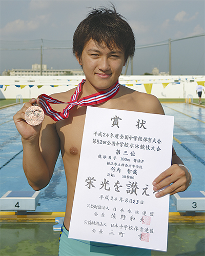 8月26日から30日に東京・辰巳国際水泳場で行われた「第35回全国JOCジュニアオリンピックカップ夏季水泳競技大会」で、神奈川中学校の竹内智哉君(2年)が、男子13歳〜14歳の部・100m自由形で3年生らを押しのけ優勝を掴み取った。