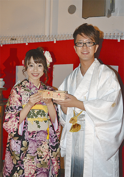 同商店街で式を挙げたのは、区内在住で音楽活動をしている荒幡亮平さんと淳子さん。着物姿の新郎新婦は、商店街に訪れていた大勢の人から「おめでとう」とクラッカーを鳴らしてもらいながら登場。ブラスバンドの演奏とともに仲見世通りを練り歩き、空き地にセッティングされた「式場」に入場、神前式で2人の門出を祝った。その後鏡開きを行い、振る舞い酒は列席者だけでなく、式場の周りに集まった人たちにも振る舞われた。披露宴では友人のミュージシャンや新郎新婦によるライブも行われ、ミュージシャンらしい華やかな式となった。