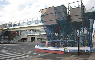 同歩道橋の工事は2010年12月に発注されており、14年3月の完成を目指している。地下に埋められたライフラインの移設は終わっており、3月にかけて階段やデッキを作り上げる予定。その後、エレベーター工事と歩道の再整備に着手する計画だ。同様に、神奈川二丁目歩道橋も1年後の完成を目指している。
