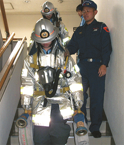 4人は、予防業務として「心肺蘇生法」の指導方法や文化財防火デーに関する火災予防巡視を体験したほか、警防業務として消防車の資機材取扱いなどを体験した。実際に消防隊員が着装する防火衣・防火帽・空気呼吸器・ホースなど、約20kgを超える装備を身にまとい、1階から5階までの階段を往復すると、「熱い」「重たい」などと悲鳴をあげていた。