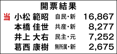 神奈川区の市議会議員補欠選挙の投開票が3日に行われ、自民党から出馬した小松範昭氏(56)が1万6867票を獲得し初当選を果たした。