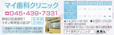 東神奈川イオン内にある「マイ歯科クリニック」は2000年の開院以来、地域のホームドクターとして可能な限りの治療法を提案。将来にわたり口腔内の状態を予測し、健康な歯を維持できるよう努めている。井上正人理事長は「子どもの虫歯からご年配者の口腔ケアまで、幅広い治療に対応したいと思っています」と話している。