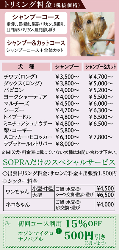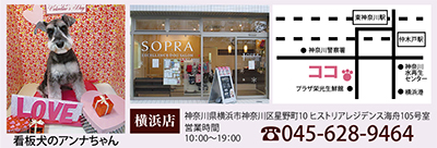 あのエクセレンスドッグサロン「ソプラ銀座」がこのほど、コットンハーバー地区に横浜店をオープンさせた。同店は「ワンちゃんとオーナー様をもっとHAPPYに…」をコンセプトに、経験豊富なトリマーが極上の品質を提供。店内はもちろん、自宅でトリミングを受けられる出張サービス(出張費1800円)も人気を博している。急な外出時には「シッターサービス」がお勧め。その他、送迎サービス(往復525円〜)やホテルサービスがあり、仔犬の紹介サービスも提供予定となっている。