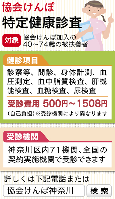全国健康保険協会(協会けんぽ)では、加入者の家族向けの特定健康診査を費用の一部を負担して実施している。特定健康診査とは、脳卒中などの病気につながる糖尿病など、生活習慣病の原因となるメタボリックシンドロームに着目した健診。健診後は必要に応じて保健師等による保健指導が無料(神奈川県内、他県はHP要確認)で受けられる。対象者は同協会加入の40歳から74歳の被扶養者(家族)。県内約2600の健診機関で受診でき、費用のうち6325円を協会が補助。県内では500円から1508円(上限)の自己負担で受診できる。対象者には受診券が送付されているが、受診券がない場合は同協会まで連絡を。保険証の保険者名称が「全国健康保険協会」となっていれば受診できる。また健診機関により被保険者と同じ生活習慣病予防健診(特定健診項目以外に胸部胃部レントゲン検査など)が特別価格で受けられるので相談を。