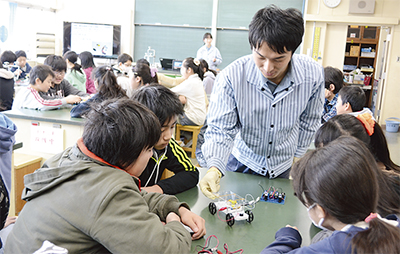 当日は、6年生約150人を対象に、リチウムイオンバッテリー向けの材料を開発している同社が講義・実験・体験の3本立てで授業を行った。研究開発に携わっている相澤美幸さんが電気の働きや電池の種類、充電池の特徴について講義したあと、児童たちは「乾電池」「手回し発電」「リチウムイオン電池」の3つを使って車の模型を走らせ、速度やモーター音の違いを実験した。最後は校庭で同社製品を搭載した電気自動車、三菱自動車i―MiEV(アイミーブ)に試乗。児童たちは「排気ガスがないから臭くない」「静かで乗り心地がいい」など、電気自動車の特徴を体感した。
