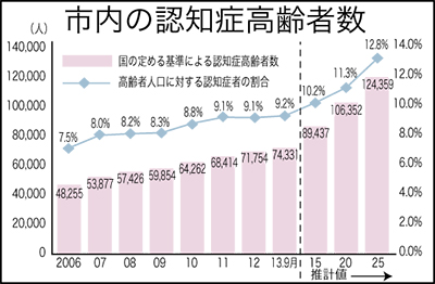 高齢化とともに、認知症患者数も増加しており、国が定める基準に沿った認知症高齢者の人数は、13年9月末時点で約7万4千人。こちらも2025年には約12万4千人になると推計されている。