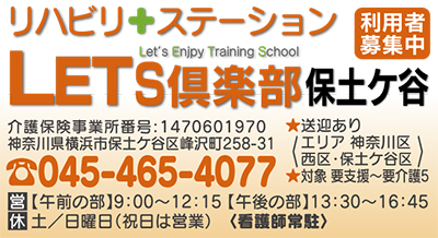 「腰や足の痛みで歩くのがしんどい」「立ったり座ったりの日常動作が最近つらい」―。リハビリデイサービス「レッツ倶楽部・保土ヶ谷」はそうした方と共に体の機能維持・回復を目指すデイサービス。