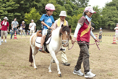 菅田地区で恒例となっているデイキャンプ。11回目となった今回は、約130人の親子が参加し、水鉄砲やシャボン玉などのほか、元田会長の提案でポニーの乗馬体験も行った。手綱を引く子どもたちの気分はまさにカウボーイ。エサやりも行い、最初は怖がっていた子も顔や体を触って仲良くなれたようだった。