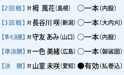 シードで2回戦から出場した朝飛さん。他県の強豪相手に内股や大内刈などを次々と決めていき、オール一本勝ちで決勝へと駒を進めた。迎えた決勝戦では、山室未咲さん(愛知県)を相手に有効を取られ、制限時間内での巻き返しは図れなかったが、最後の全中で準優勝という輝かしい成績を残すことができた。朝飛さんは「自分の柔道ができて良かった。優勝できなかった悔しさもあるので、今後さらに励みたい」と喜びを語った。