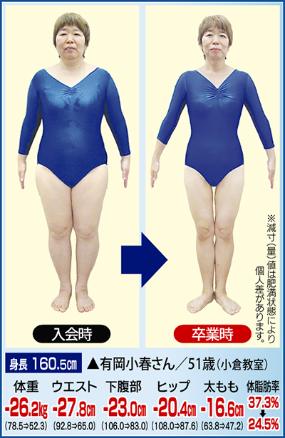 肥満は個性と思って気にしなかった有岡さん。健診で医師から「痩せなさい」と言われた事で目が覚め、すぐに痩身を決意。激しい運動はなく20種類の多彩なスリムマシンは”乗るだけ・座るだけ”そんなプロポーション・アカデミーと出会い、「ここしかない!」と入会。まずは体質・体型を調べて専用スリムプランを作成。全身にたっぷりついた脂肪をほぐしたことで「予想していた以上!」と本人も驚く26・2kg減の大幅減量に成功。さらに引き締めたい部分に「特殊特急マシン」を併用。お腹23cm減、ウエスト27・8cm減を達成。体調も改善し、”美しく健康的に痩せる!”が実現。
