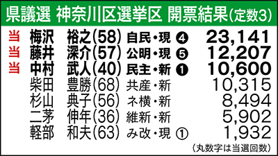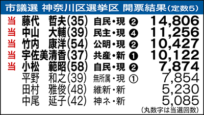 4月12日に投開票が行われた市議選神奈川区選挙区(定数5)は、自民党の現職・藤代哲夫氏がトップ当選を果たした。新人では、共産党の宇佐美清香氏が当選。前回トップの無所属・平野和之氏は20票差で涙をのんだ。一方、県議選(定数3)は自民党の梅沢裕之氏が4回連続のトップ当選を果たした。