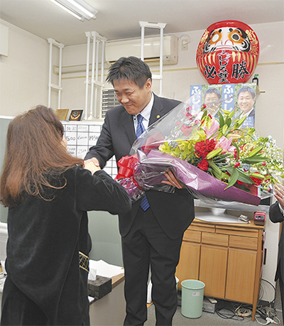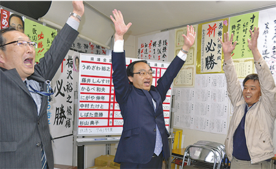8人によって争われた市議選。トップ当選を果たした藤代氏は、車に乗らず遊説する選挙戦を展開。消防団員としての経験をいかした防災・減災のまちづくりや、税収に頼らない公共建築物のメンテナンスを訴えた。午後11時半頃、開票所からの連絡を受けて当選を知った藤代氏は、「多くの方に支えてもらったおかげ。地域の代表として2期目もしっかりと活動していきたい」と、選挙事務所に駆けつけた支援者らの前であいさつした。