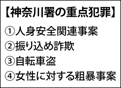神奈川警察署(横田善信署長)は、この春から「人身安全関連事案」「振り込め詐欺」「自転車盗」「女性に対する粗暴事案」の4項目を重点犯罪に指定した。項目の中には、認知件数が減少傾向にある反面、依然として被害が後を絶たない犯罪もあり、今後対策強化を進めていく。
