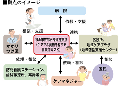 神奈川区の拠点は、区医師会訪問看護ステーションがあるはーと友神奈川内に設けられ、ケアマネージャーと看護師の2人が対応にあたる。区民から相談を受けた区役所や地域ケアプラザの依頼により、かかりつけ医の紹介や病院退院後の在宅療養についての相談、訪問看護・訪問リハビリの情報提供などを各機関と連携し行っていく。看護ステーション管理者で、1日から拠点スタッフとなる木村光代さんは「この拠点がどのようにリーダーシップをとって連携していくかが重要」と位置付ける。