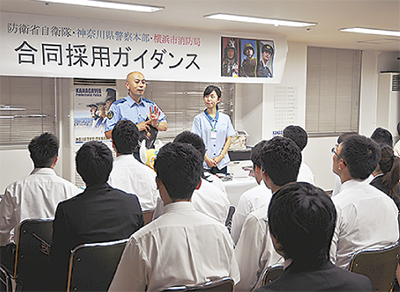 横浜市消防局と防衛省自衛隊、神奈川警察本部が8月7日、「合同採用ガイダンス」を神奈川区役所と神奈川区民文化センター・かなっくホールで行った。