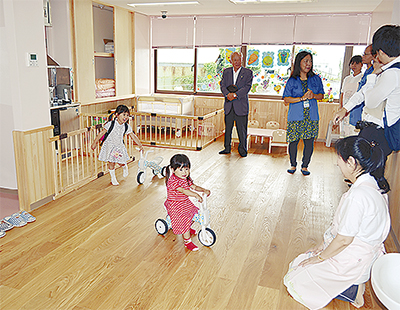 8月27日には内覧会とレセプションが行われ、柏崎誠副市長など関係者100人以上が駆けつけた。室内は床暖房完備、母乳で育てたい母親のために専用冷凍庫も設置された。300平方メートルある体育館の一部には遊具も用意されている。また、給食には市場に届いた新鮮な魚が使われる。同園を運営する横浜中央市場保育園(株)の小山正武代表は「子ども時代から魚に親しんでもらいたい」と話している。