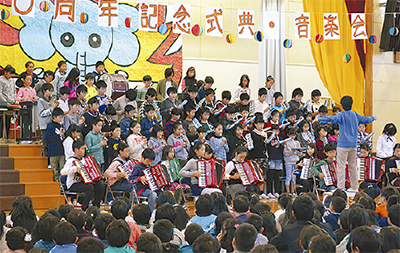 体育館には、児童が掲げた今年のテーマ「笑顔にするぞう大作戦」の横断幕やゾウの巨大イラストなどが装飾され、学年ごとに合唱や合奏を披露した。井口剛PTA会長は「感無量。次の10年へ向けて地域のみなさんに恩返しができた」と話し、高根校長は「家族や教職員が地域と協力して迎えられた60周年だと思う」と感謝を述べた。
