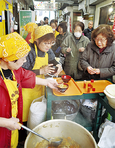 毎月第1日曜日の正午から始まるうまいもの市。主催するのは、商店主の妻である”おかみさん”たち。1杯100円のすいとんをはじめ、いなりずし、団子、大福などを販売している。野菜や鶏肉など9種類の具材が入った特製のすいとんは、自宅から鍋を持って大量に持ち帰る人もいるほど。早朝から仕込んだ200食分は、毎回30分程度で完売してしまう。