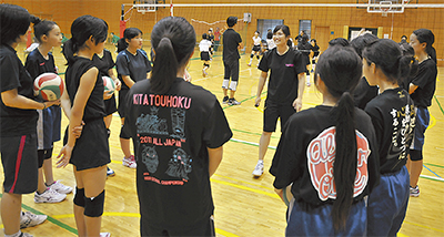 学生と一緒に指導にあたった宝積監督は「バレーボールの普及のためにお手伝いしている。一人でも多くの生徒が大学へ行っても競技を続けてほしい」と話した。初参加の生徒は「欠点を指摘してもらったので、今後に生かしていきたい」と笑顔で練習を振り返った。
