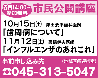 9月10日開催の公開講座「健康寿命を延ばすためにも大切になってきた歯の健康」(山本龍生歯科医師)は現在、参加受付中。申し込みは【電話】045・313・5047。