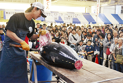 恒例のマグロ解体ショーや模擬せりのほか、東京湾と相模湾で見られる魚に触れるブースも人気で、シュモクザメを触った男の子(9)は「柔らかかった」と興味津々の様子だった。