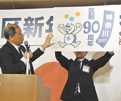 2017年を「区制90周年イヤー」と位置付ける神奈川区。各連合自治会町内会長ら58人が名を連ねる記念事業実行委員会が昨年7月に発足し、10月の記念式典・区民まつりをメーンに様々なイベントを企画している。今回のキックオフイベントでは、記念ロゴマークの発表と、神奈川ロータリークラブからの絵本の寄贈が行われた。