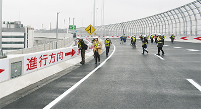 当日は、全線の約7割を占め、首都高最長となる横浜北トンネルも公開。参加者は、内部に備えられた、首都高初となる滑り台式非常口などの防災設備を体験したほか、トンネル下にある避難路も歩いた。