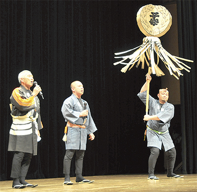 このワークショップは、木遣りを通じて文化に触れてもらおうと、同ホールが企画したもの。岩崎さんは市内外から集まった参加者約40人に、手本を示しながら入門用の曲目である「真鶴」「手古(てこ)」を伝授。修行中の息子たちの話題に触れながら「我々も1年で1曲ずつ覚えていくが、歌わないと半年で忘れてしまう」と反復練習の大切さを伝えていた。