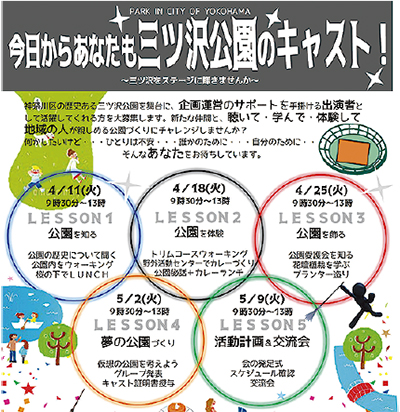 三ツ沢公園内で5日間かけて歴史を学ぶ活動やプランター造り、仮想の公園づくりを話し合い、発表するなどの活動を通して公園内の企画運営をサポートするノウハウを学ぶ。最終日には出演者で会を発足し活動計画の話し合いや交流会が開かれる。参加者にはキャスト証明書も配られる。