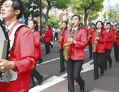 神奈川区内からは孝道山や横浜創英中学・高等学校マーチングバンド、神奈川大学吹奏楽部などがパレードした。