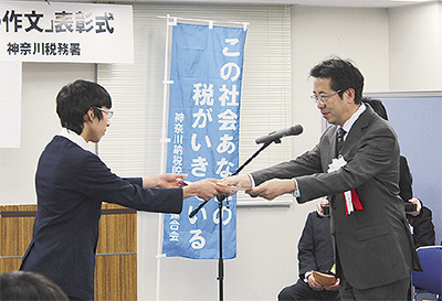 2017年度「中学生の税についての作文」の表彰式が先月末、神奈川税務署で行われた。神奈川納税貯蓄組合連合会(石川圀光会長)が、同税務署管内の神奈川・港北区の中学生を対象に募集。各区の中学校24校中20校から集まった。