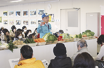 横浜市中央卸売市場本場は2月17日、同センターで野菜ソムリエ上級プロの清水厚雄さんを招き、「お野菜講座」を開いた。会場には100人ほどが集まり、講師の話しを熱心に聞いていた。