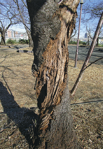生育環境にもよるが、一般的にソメイヨシノの寿命は約60年。約70年前に植えられた同公園の桜は近年、幹が傷んだり、枝が落下したりするものが増えてきた。2012年には高さ15mの桜が倒木。折れた部分からは、直径10cmほどの「コフキタケ」というキノコが確認されている。