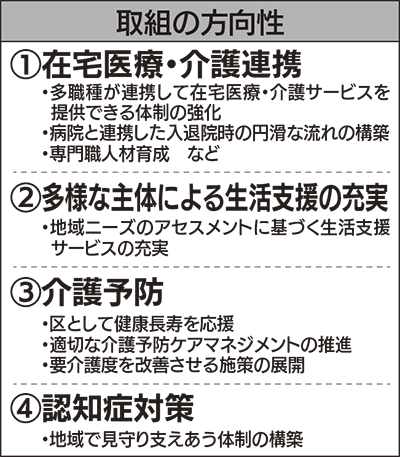 神奈川区では25年に高齢者人口が3千人増加し、高齢化率が23%まで上昇すると予想。認知症や認知症の疑いがある人が1千人弱増加、自宅での看取り件数も現在の3倍以上に増える可能性があると言われている。これらを踏まえ、同指針では、【1】在宅医療・介護連携【2】多様な主体による生活支援の充実【3】介護予防【4】認知症対策――の4分野を重点方針と位置付けた。
