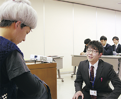 今回は、1年間銀行業務を経験した新人のフォローアップ研修として23人が参加。同銀行と意見を交わし、窓口業務を想定した認知症の人への対応を寸劇で行い、理解を促した。寸劇には学生だけでなく、銀行員役で新人職員の宇佐美史明さんも参加し、模範となる銀行員を演じた。