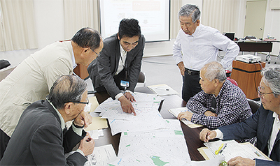 この講座は「町の防災組織」や地域防災拠点運営委員を対象に開かれたもの。「地域の防災マップ」の必要性や作成手順について同社の山本真司さんが登壇した。