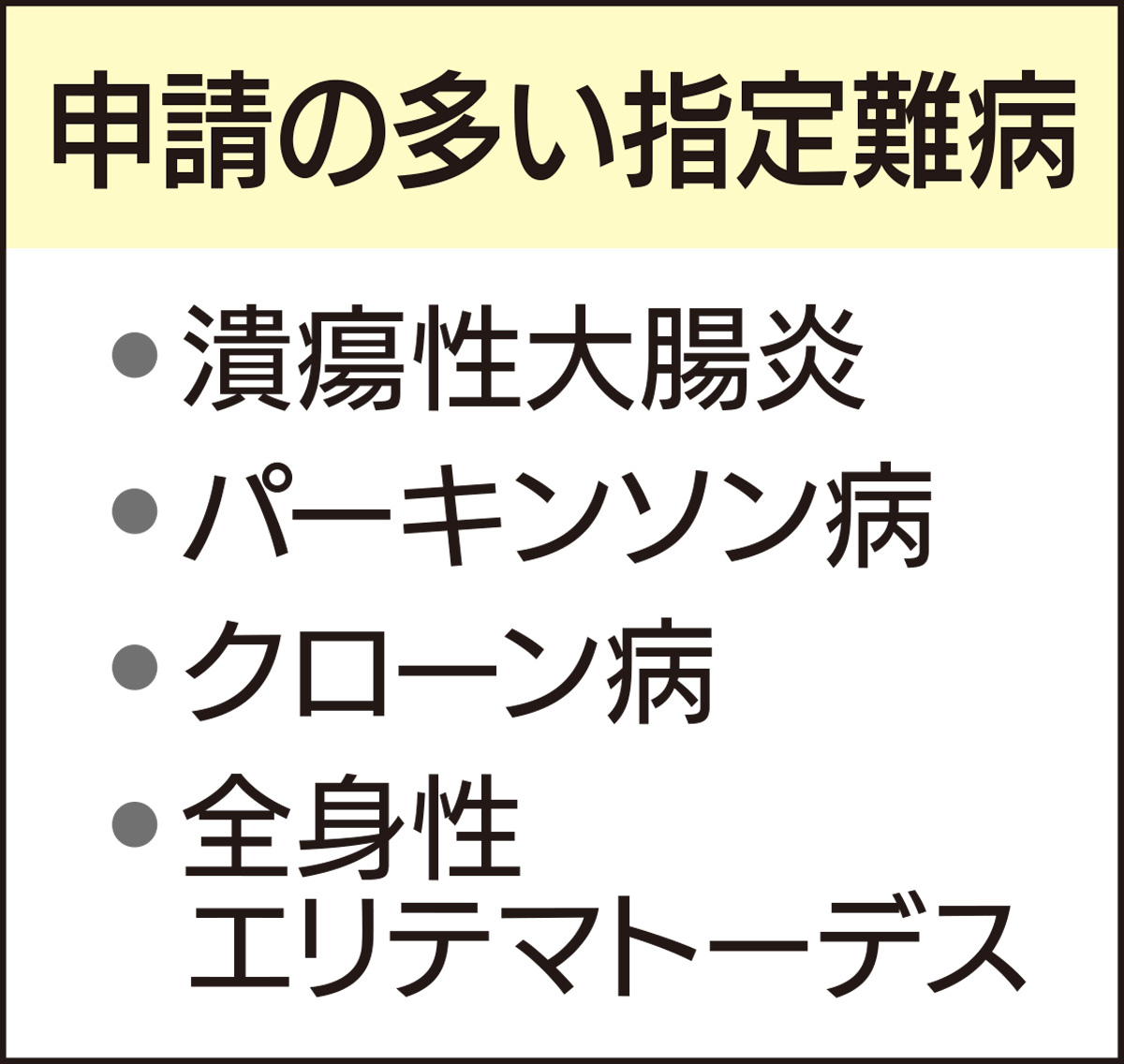 指定難病とは、原因不明で治療方法が確立していない難病のうち、厚生労働大臣が定める疾患。治療が困難で医療費は高額に及ぶことから、基準を満たした人を対象に医療費の一部助成を行っている。現在は331の疾病が対象で、市によると潰瘍性大腸炎やパーキンソン病などによる申請が多いという=表参照=。