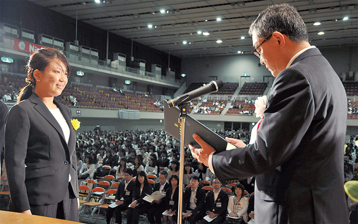 2018年度の横浜市幼稚園大会が6月20日、横浜文化体育館で開催され、勤続5年以上の教員と職員445人が表彰された。区内からは24人の教職員が、永年勤続者として登壇した。