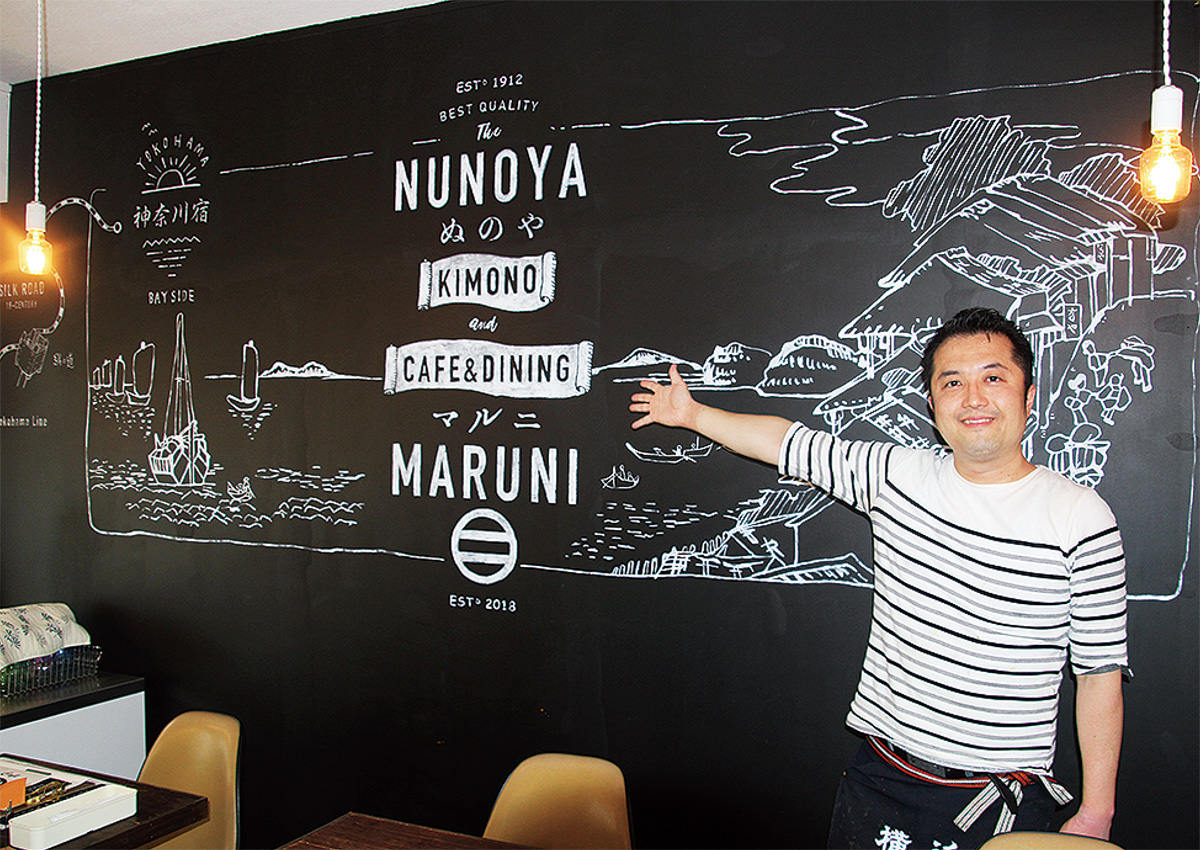 神奈川区役所前の横浜マルニカフェダイニング(河西元代表)はこのほど、店内に神奈川宿をPRする壁画を完成させた。同店は築100年の老舗呉服店「ぬのや」の3分の2をリノベーションし、誕生。現在は残り3分の1のスペースで「ぬのや」も営業している。
